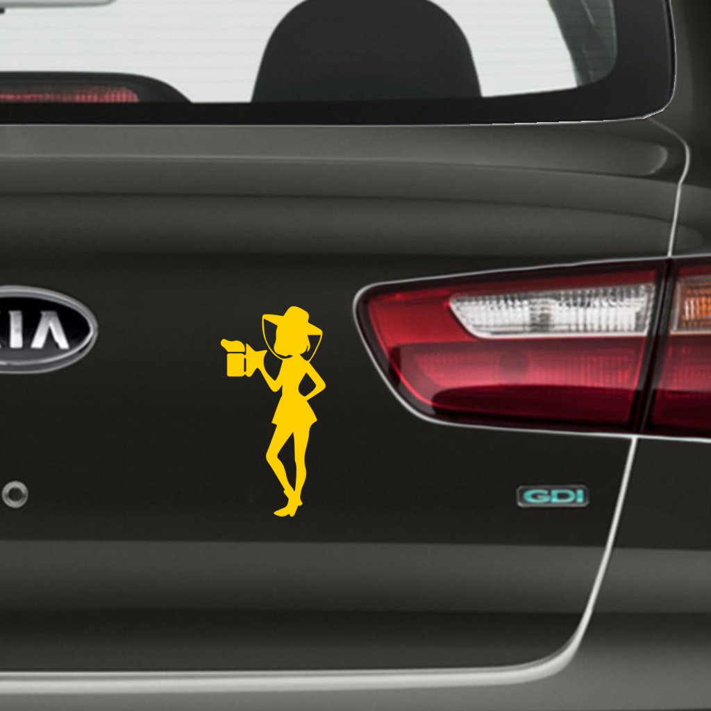 Image autocollante d'une apicultrice avec un enfumoir en version jaune, donc adaptée aux surfaces plus foncées. Cet autocollant est fabriqué dans un matériau imperméable avec une colle de qualité, ce qui le rend approprié même pour des environnements exigeants, par exemple pour votre voiture.