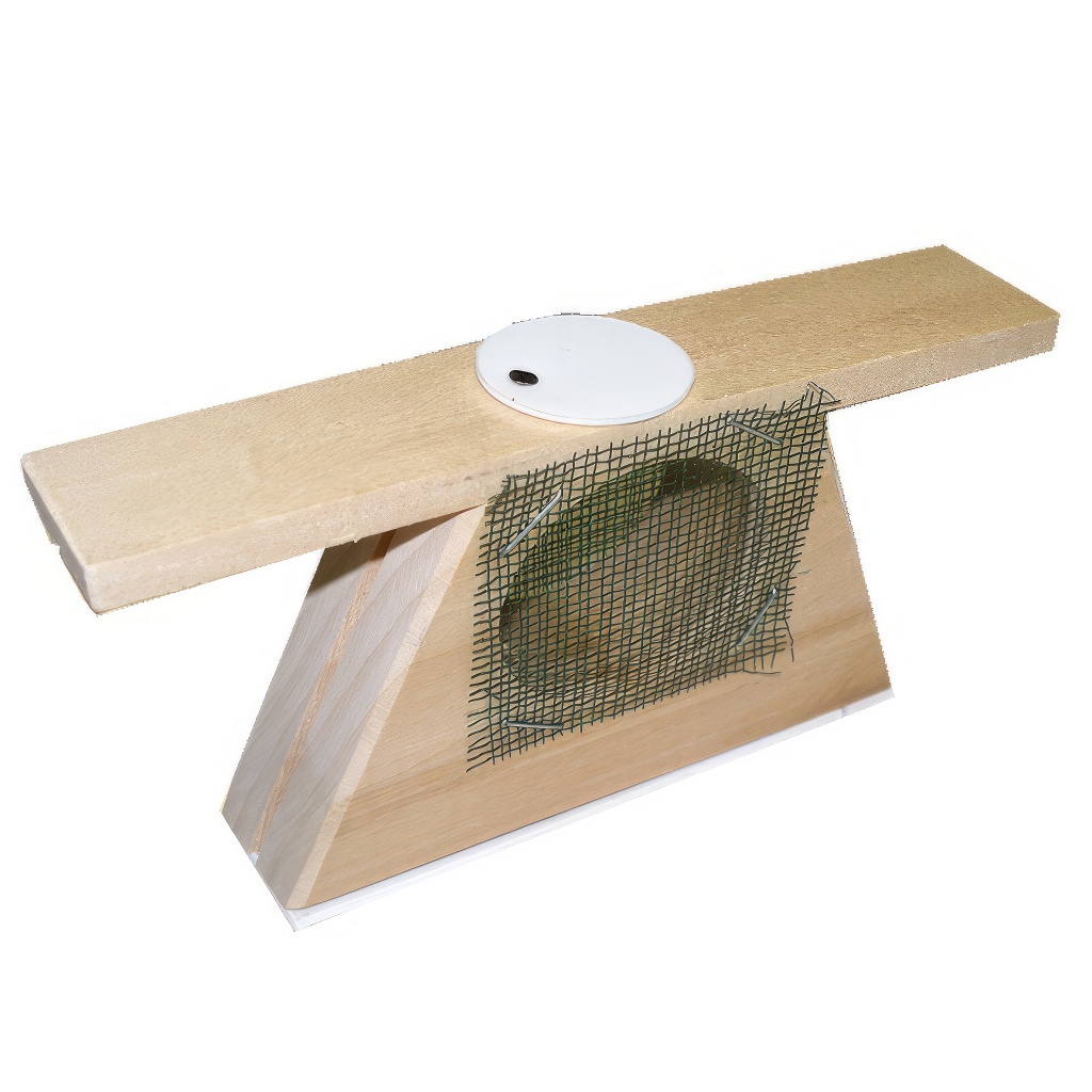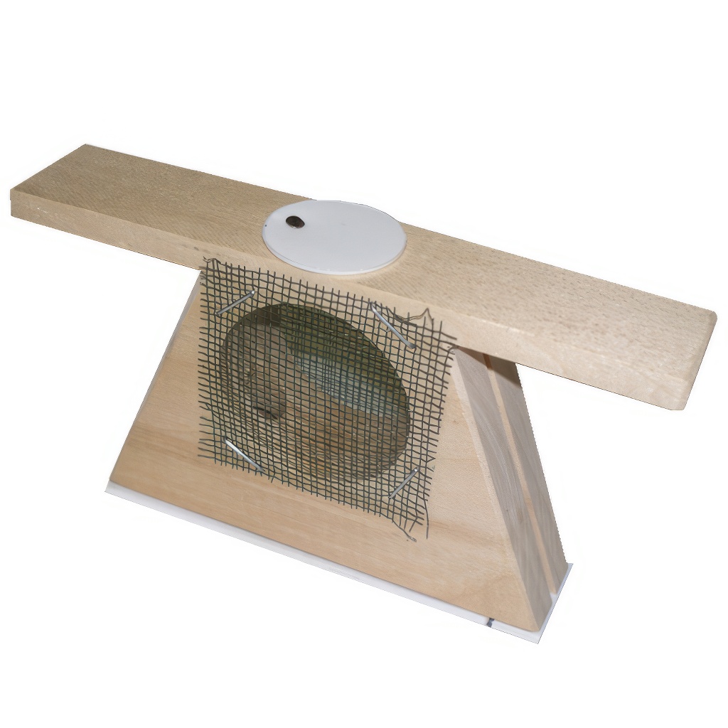 Cage d'introduction apicole classique. La cage en bois pour l'introduction de reines est conçue de manière à ce que des trous d'un diamètre de 35 mm soient placés sur les côtés et recouverts d'un grillage métallique. Au fond de la cage se trouvent des trous destinés à l'insertion d'un bouchon temporaire en pâte de candi. Une fois que vous insérez le candi dans le trou, celui-ci est fermé par un couvercle en plastique avec un trou de passage d'un diamètre de 8 mm, par lequel les abeilles rongeront pour accéder à la reine. La libération de la reine prend environ deux jours. L'orifice d'introduction de la reine est fermable par un bouchon.