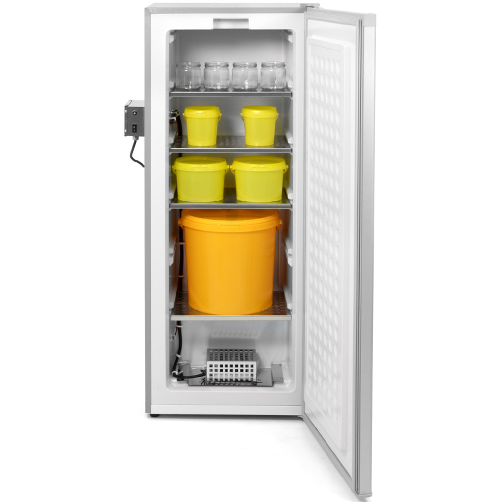 L'espace intérieur correspond à la pratique courante en apiculture. Pour de plus gros volumes de miel, 1× cuve de soutirage de 50 kg ou 2× cuves de 25 kg rentrent confortablement à l'intérieur.