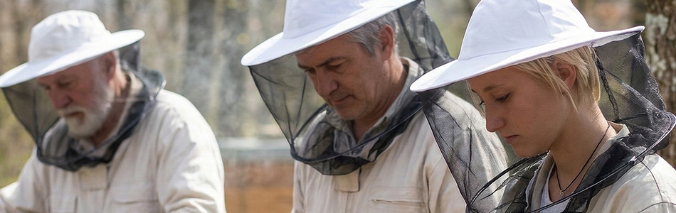Le chapeau est fabriqué en tissu rigide de toile écrue blanche, grâce auquel il conserve bien sa forme. Le large bord (diamètre 400 mm) maintient le voile à distance sécuritaire du visage, ce qui réduit considérablement le risque de piqûre lors du travail à la ruche. Un voile léger en tulle est solidement cousu au pourtour du chapeau, protégeant le visage, le cou et la nuque.