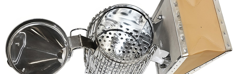 Grand enfumoir apicole en acier inoxydable d'un fabricant allemand, fabriqué à partir d'alliages d'aciers inoxydables de qualité. Amélioré avec une cage plus dense pour une sécurité accrue. Enfumoir apicole avec soufflet en cuir.