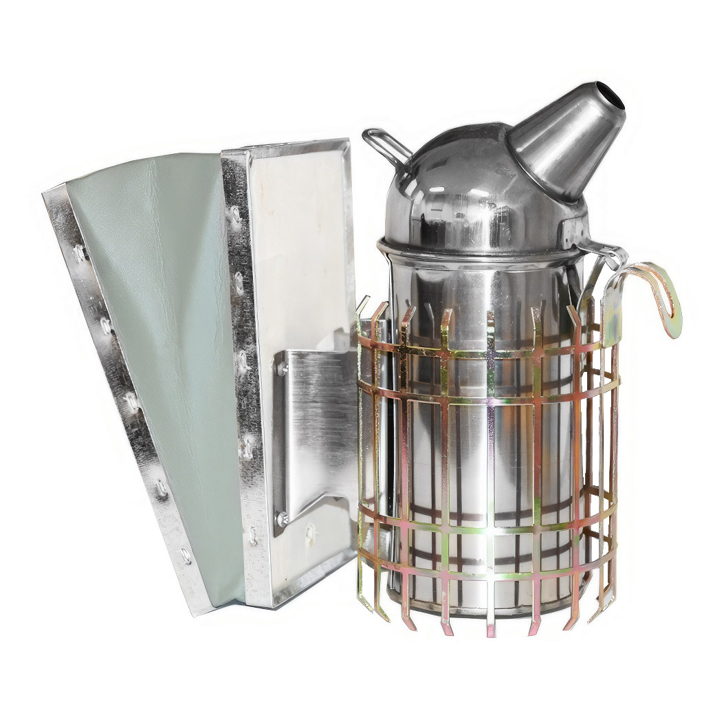 Grand enfumoir apicole en acier inoxydable avec insert pour faciliter le vidage des cendres. Il est équipé d'une grille de sécurité contre les brûlures et d'un crochet pour le suspendre. Soufflet en cuir de qualité.