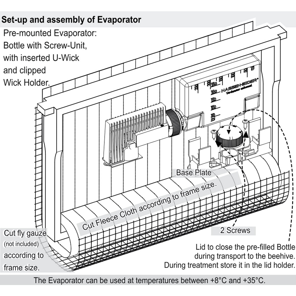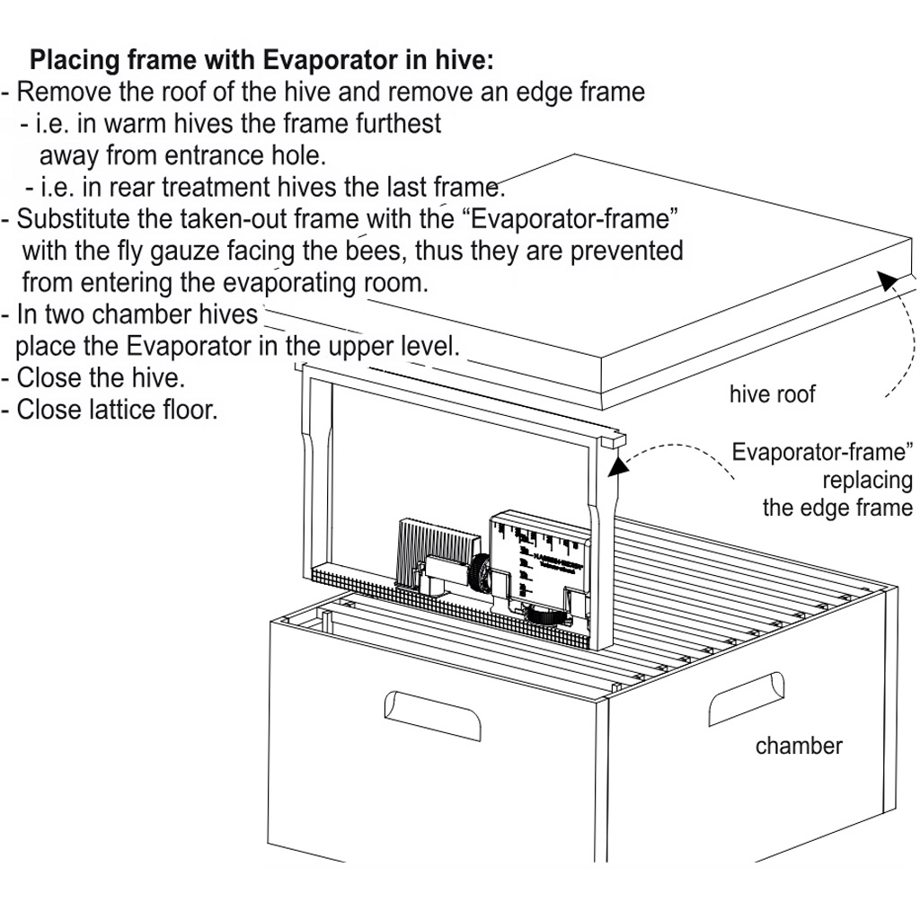 L'appareil fonctionne selon le principe d'une évaporation contrôlée et stable à long terme du liquide à l'intérieur de la hausse. La construction brevetée assure une évaporation continue et uniforme pendant jusqu'à 10 jours ou plus (selon le réglage choisi et les conditions dans la ruche), même en cas de fluctuations des températures extérieures. Le déroulement stable de l'évaporation est essentiel pour un traitement efficace de la colonie tout en minimisant le stress et les perturbations excessives des abeilles.