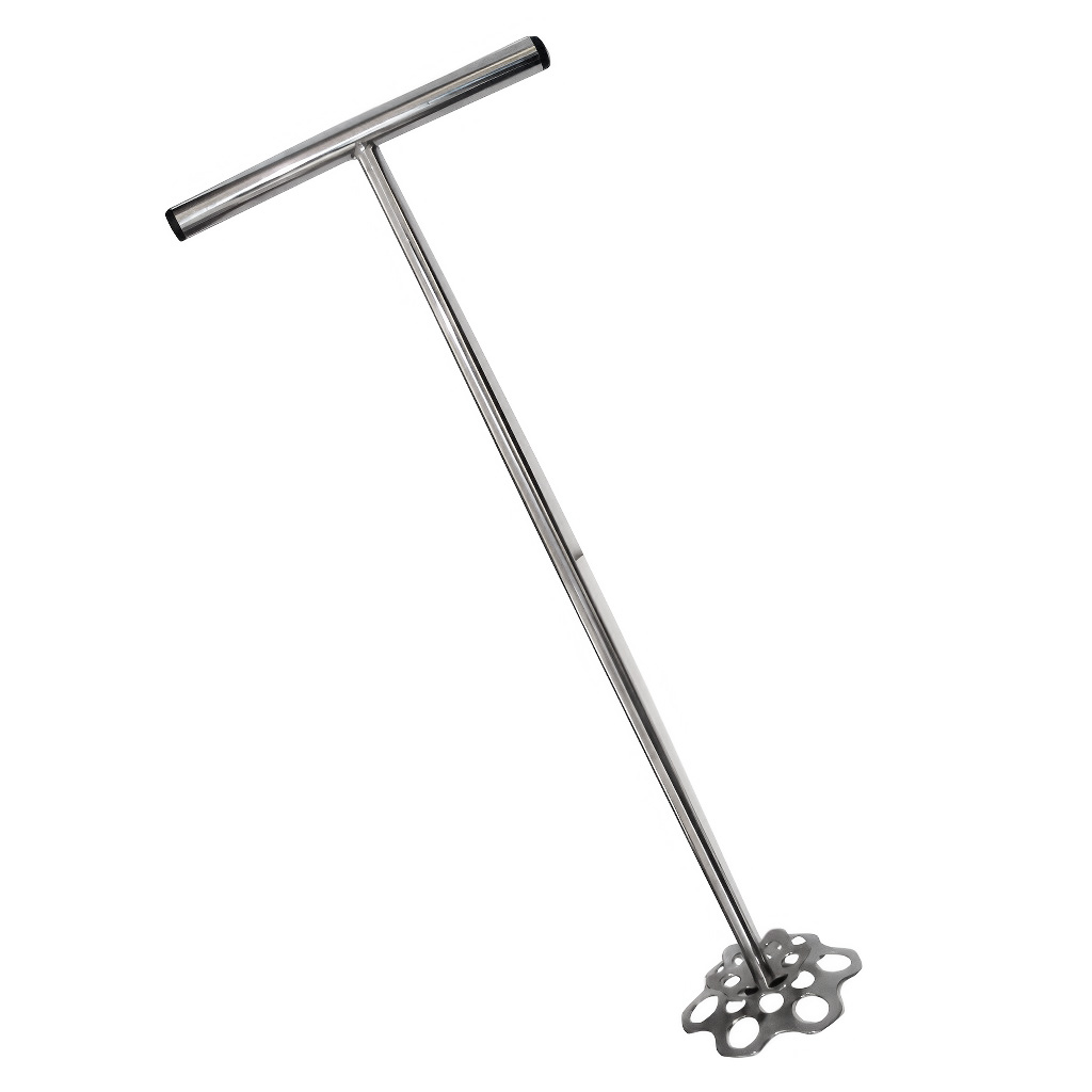 Le crémeur est fabriqué en acier inoxydable alimentaire de qualité, hygiénique, résistant et facile d'entretien. La surface inox n'absorbe pas les odeurs, se nettoie facilement et résiste au milieu naturellement acide du miel. La longueur totale de 625 mm est idéale pour travailler confortablement dans la plupart des maturateurs – vous atteignez facilement le fond sans avoir à trop vous pencher au-dessus du récipient.
