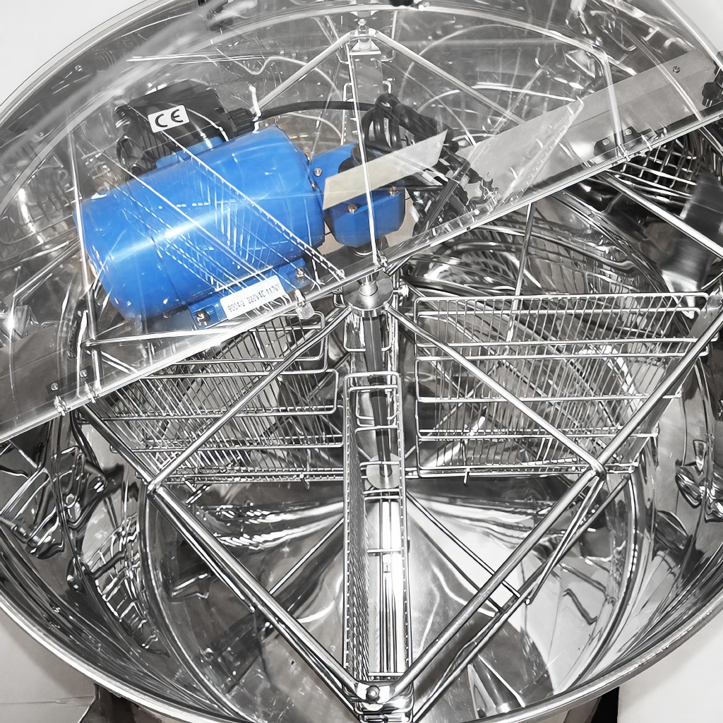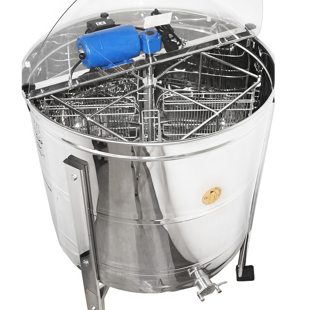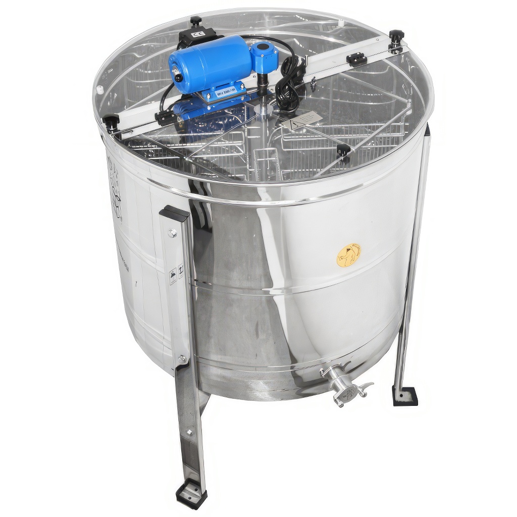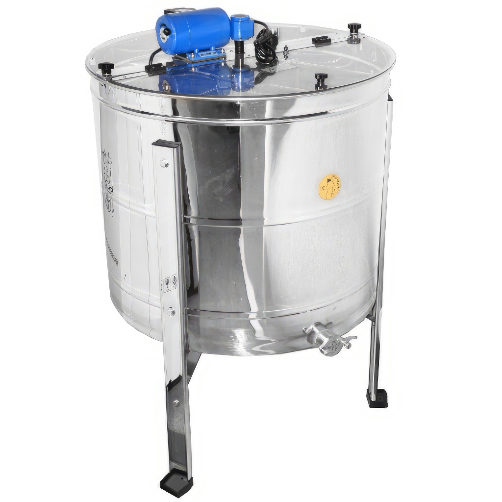 Extracteur de miel réversible Mellarius 4 cadres. Extracteur de miel apicole à entraînement électrique. Le moteur électrique est placé sur une barre de hausses dans la partie supérieure de l'extracteur, ce qui permet de démonter facilement l'extracteur pour le nettoyage. Il est équipé d'un régulateur de vitesse simple et fiable directement sur le stator du moteur. Dimensions du panier : profondeur 46 cm x largeur 29 cm. L'avantage de cet extracteur à quatre cadres est le petit diamètre du tambour (76 cm), ce qui assure un bon passage par les portes. La hauteur de l'extracteur avec le support métallique est d'environ 112 cm. Toutes les parties de l'extracteur qui entrent en contact avec le miel sont entièrement fabriquées en acier inoxydable. La transmission de la force rotative du moteur se fait sans problème grâce à des roulements de qualité. Un nouvel extracteur est certainement un excellent outil pour tout apiculteur. Les extracteurs bénéficient d'une garantie complète de 2 ans. Nous offrons à nos clients un service complet de garantie et après-garantie. Nous facilitons la possibilité d'échange et de fourniture de pièces de rechange. Les extracteurs possèdent un certificat européen de qualité et de sécurité CE. Garantie 24 mois.