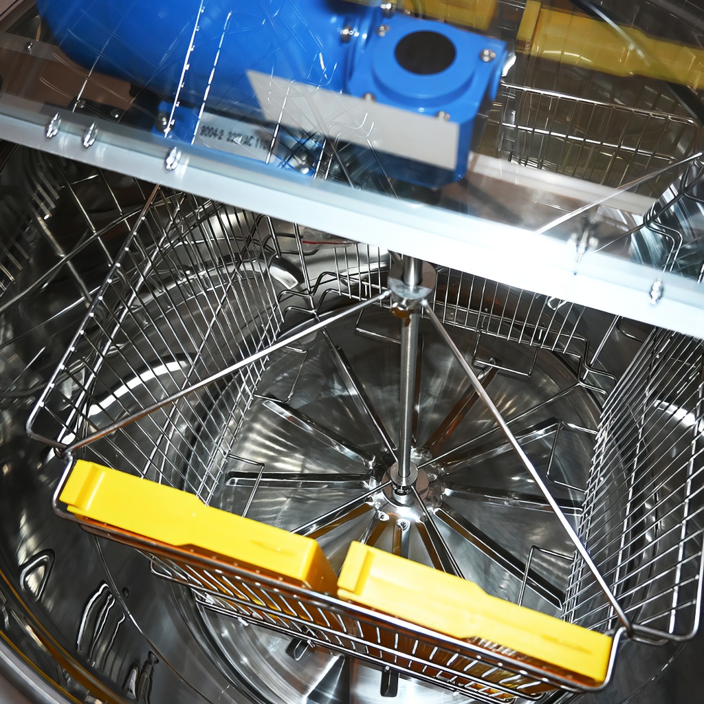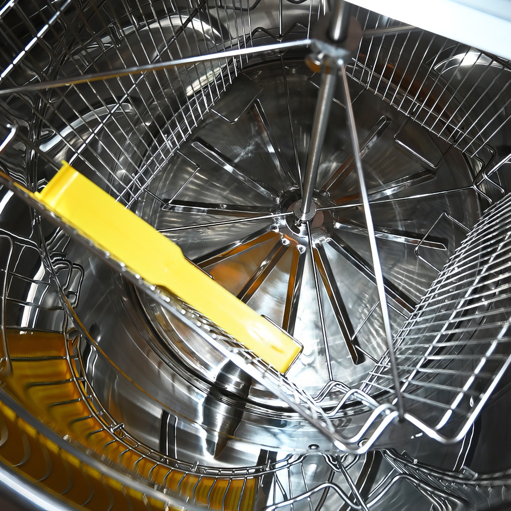 Extracteur de miel tangentiel pour quatre cadres avec moteur électrique 230 V d'une puissance de 110W. La largeur du panier est de 36 cm, l'extracteur convient donc à la plupart des cadres. L'extracteur est fabriqué en tôles d'acier inoxydable polies, conformes aux normes pour le contact alimentaire. Conception haut de gamme avec fond conique et de nombreux autres éléments innovants. Cet extracteur est équipé d'un panier suffisamment grand pour extraire deux demi-cadres à la fois, vous pouvez donc extraire un total de huit demi-cadres.