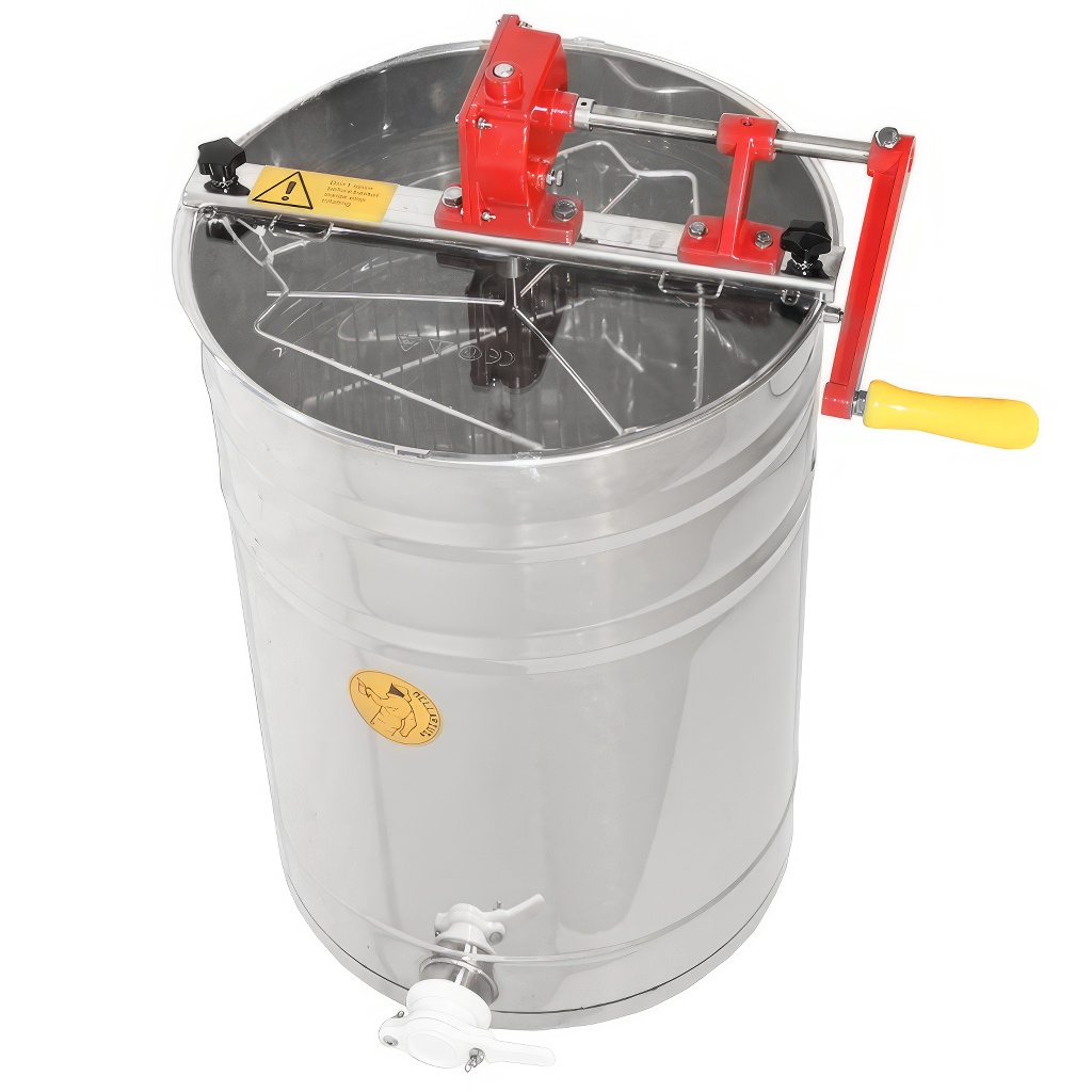 Extracteur de miel tangentiel à trois cadres avec entraînement manuel. La largeur du panier est de 24,5 cm, l'extracteur convient donc à la plupart des cadres. L'extracteur est fabriqué en tôles d'acier inoxydable polies, conformes aux normes pour le contact alimentaire.