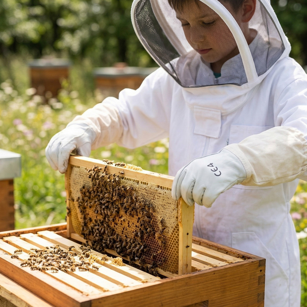 L'apiculture peut merveilleusement enseigner aux enfants le respect de la nature, la patience et la responsabilité. Pour que les premières visites aux ruches soient agréables et sans craintes inutiles, il est important de ne pas négliger les équipements de protection. Ces gants d'apiculture pour enfants en taille 4 sont confectionnés en tenant compte de la main de l'enfant – ils protègent, s'ajustent bien et permettent en même temps le travail dont vous avez vraiment besoin auprès des abeilles.