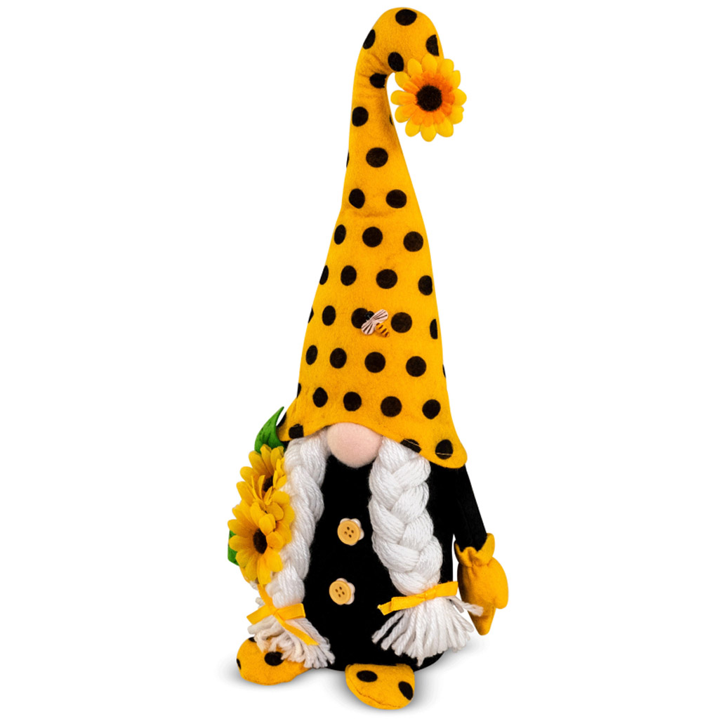 La figurine est cousue dans une peluche agréablement douce et complétée d'éléments textiles et en feutre. L'élément dominant est la longue barbe tressée, le bonnet noir et jaune dans le style abeille et dans les mains un tournesol comme symbole estival plein de pollen et de vie au rucher.