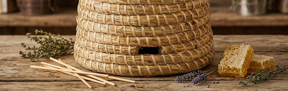 Modèle plus grand de ruche, fabriqué en paille, comme le faisaient nos ancêtres. Idéal comme décoration dans votre ferme apicole ou dans votre magasin d'apiculture.