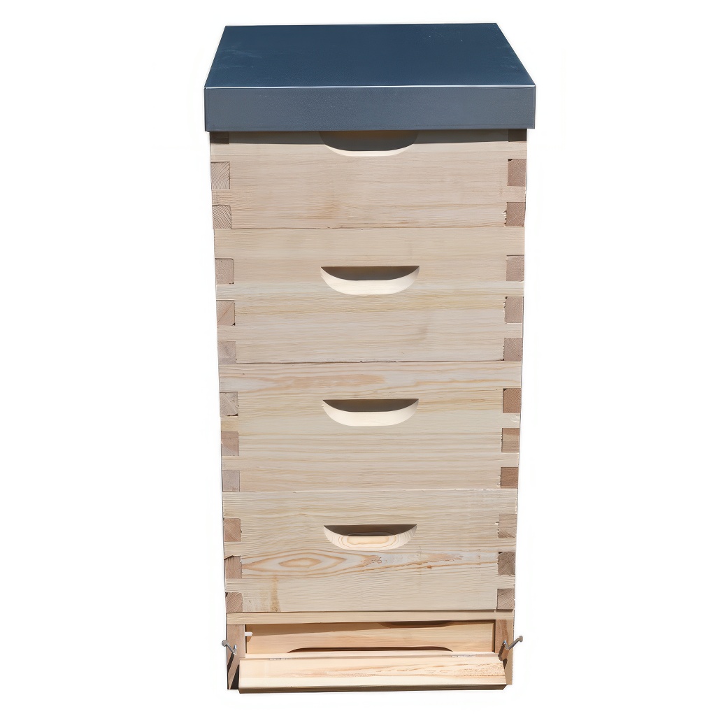 La ruche complète Langstroth se compose d'un plateau anti-varroa Langstroth (hauteur 10 cm), de 4 hausses Langstroth 3/4 (185) et d'un toit. Il s'agit d'une construction en bois non isolée. Les hausses sont livrées démontées (assemblage facile) et n'ont pas de trou de vol (vous pouvez le percer selon vos besoins).