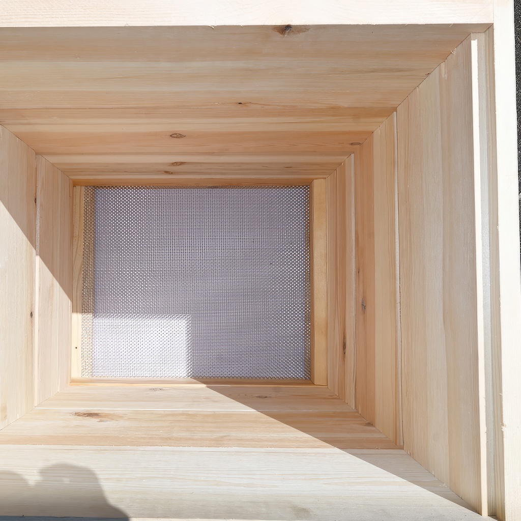 Ruche complète Langstroth composée d'un plateau anti-varroa Langstroth (hauteur 10 cm), 4 x hausses Langstroth 3/4 et d'un toit. Il s'agit d'une construction de ruche entièrement en bois non isolée.
