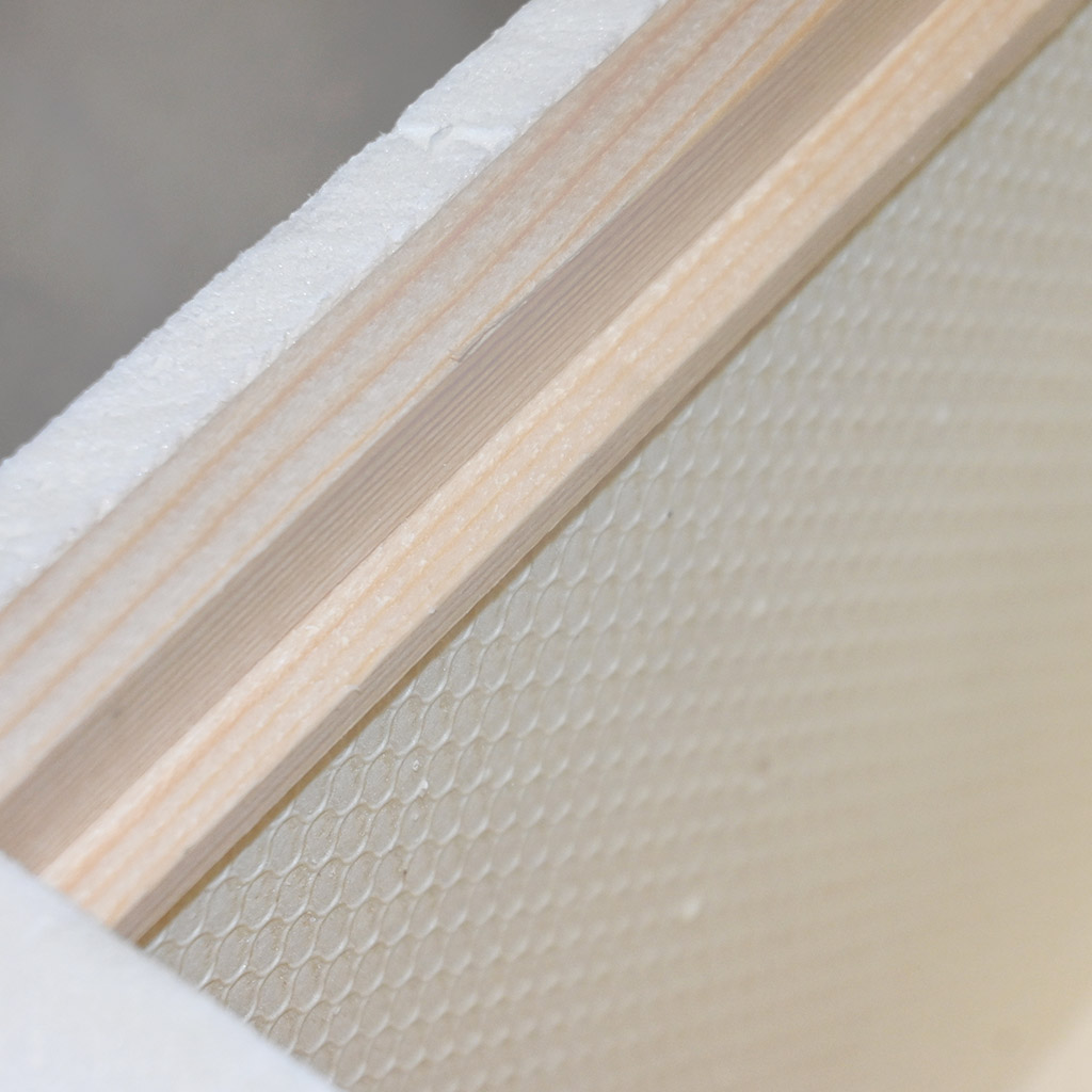 Dans une petite colonie, la chaleur au niveau du couvain est déterminante pour le succès. Les parois de 30 mm en polystyrène extrudé (styrodur) aident à maintenir un microclimat équilibré – au printemps, elles favorisent un développement plus rapide de l'essaim, en été elles atténuent la surchauffe. Le toit est isolé avec la même épaisseur d'isolation et recouvert de tôle galvanisée, ce qui lui permet de mieux résister à la pluie, au soleil et à l'utilisation courante au rucher.