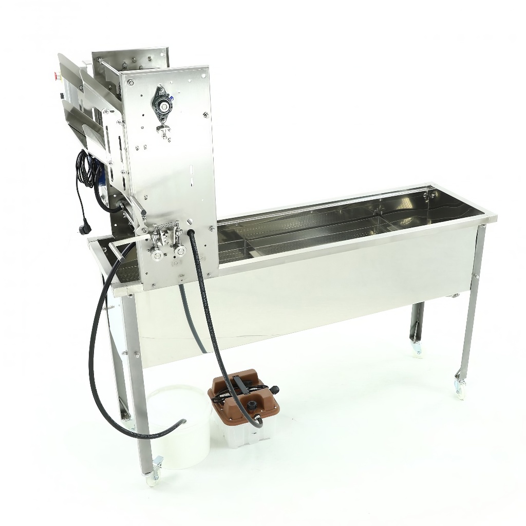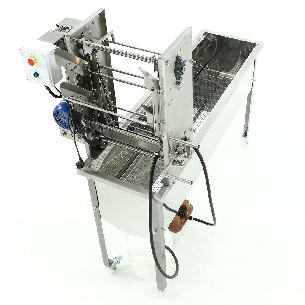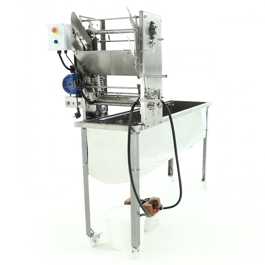 Table à désoperculer avec bac collecteur, générateur de vapeur et rails d'alimentation, MINIMALa table à désoperculer MINIMA avec générateur de vapeur et rails d'alimentation est un équipement pour désoperculer les cadres avant l'extraction du miel. Elle est très efficace et performante. L'appareil fonctionne avec des couteaux vibrants qui désoperculent les cadres. Les nouveaux couteaux modernisés permettent une désoperculation plus approfondie. Les couteaux sont chauffés par la vapeur chaude produite par le générateur de vapeur. L'appareil est équipé de rails d'alimentation pour les cadres et d'un alimentateur qui envoie automatiquement les cadres operculés vers les couteaux. Le bac collecteur est fabriqué en acier inoxydable, avec une vanne de vidange à lame en acier inoxydable 6/4" dans la partie inférieure. À l'intérieur du réservoir se trouvent deux tamis en acier inoxydable. Les pieds en acier sont peints par poudrage et montés sur roulettes, ce qui facilite le déplacement de l'appareil.Le générateur de vapeur est connecté aux couteaux à désoperculer et au récipient de condensat.